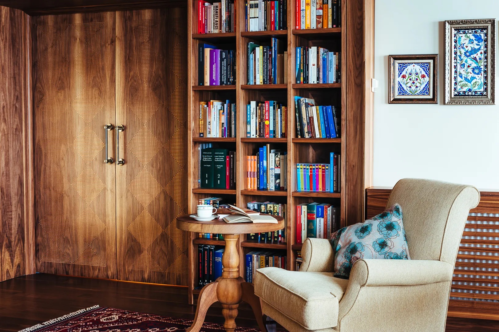 Bir okuma alanının kimliğini belirleyen en temel öge şüphesiz kitaplardır. Kitapların nasıl sergilendiği hem alanın kullanım verimliliğini hem de dekoratif etkisini belirler. Eğer uygulama yapılacak alan darsa, ağır ve hantal dolaplar yerine tavana kadar uzanan ince kitaplıklar tercih edilmelidir. Dikey kullanım, odanın olduğundan daha yüksek görünmesini sağlarken, çok sayıda kitabın tek bir noktada toplanmasına imkan tanır. Bu yöntemle dar alanlarda bile zengin bir kütüphane havası oluşturulabilir.